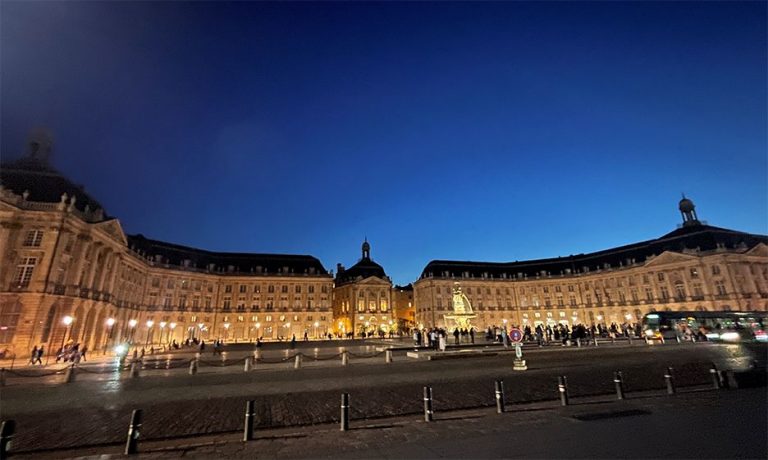 Enjoy an evening view of the Mirror d’Eau in Downtown Bordeaux.